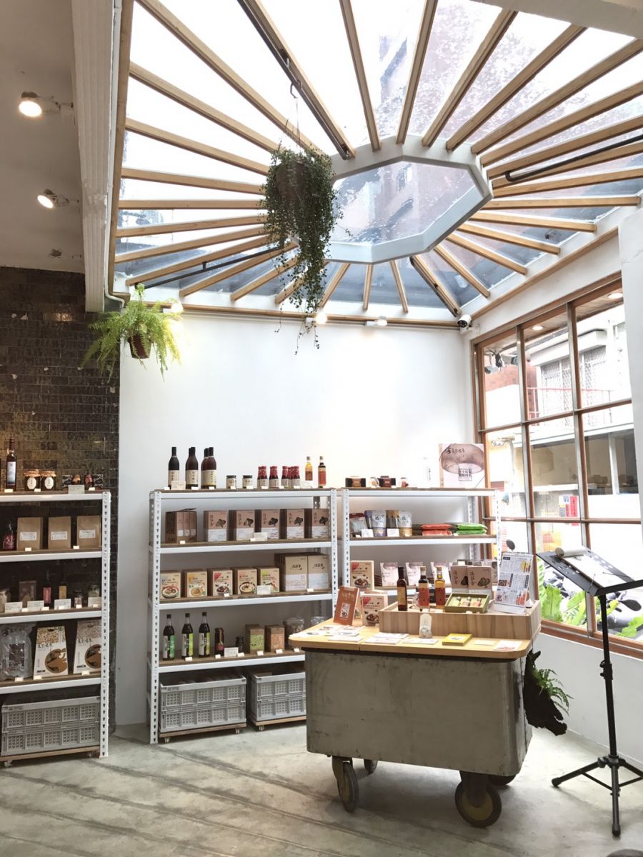 「菇事所 good thing」入口處的大幅玻璃天花版以玻璃穿插木條間隔,打造成菌傘意象,