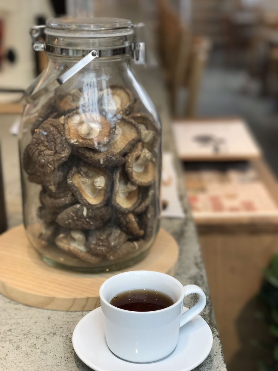 「有機香冬菇紅茶」以紅玉紅茶加乾燥香冬菇一起浸煮,茶湯釅醇,菇香襲人。