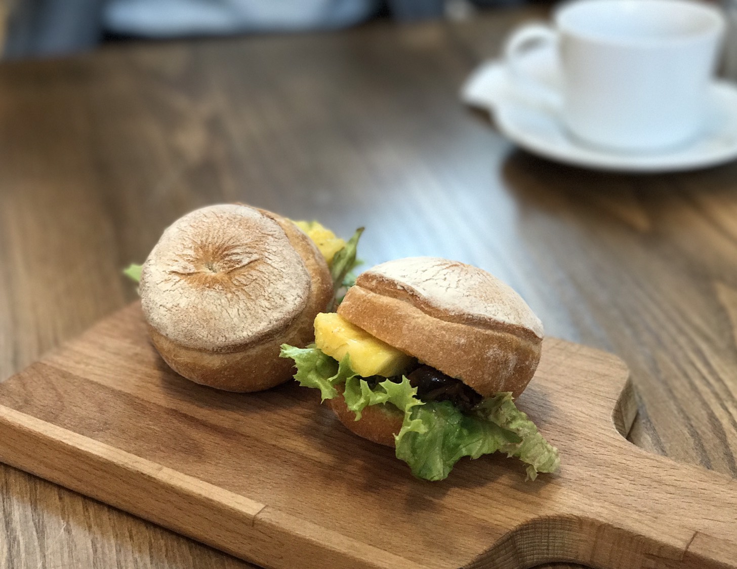 | 做成香菇外形的「蘑菇球」餐包夾入新鮮鳯梨、大朵香菇,可選要抺入菇菇伴醬或是蜂神蜂蜜口味,麵包軟硬度適口,是我最喜歡的餐點。 |