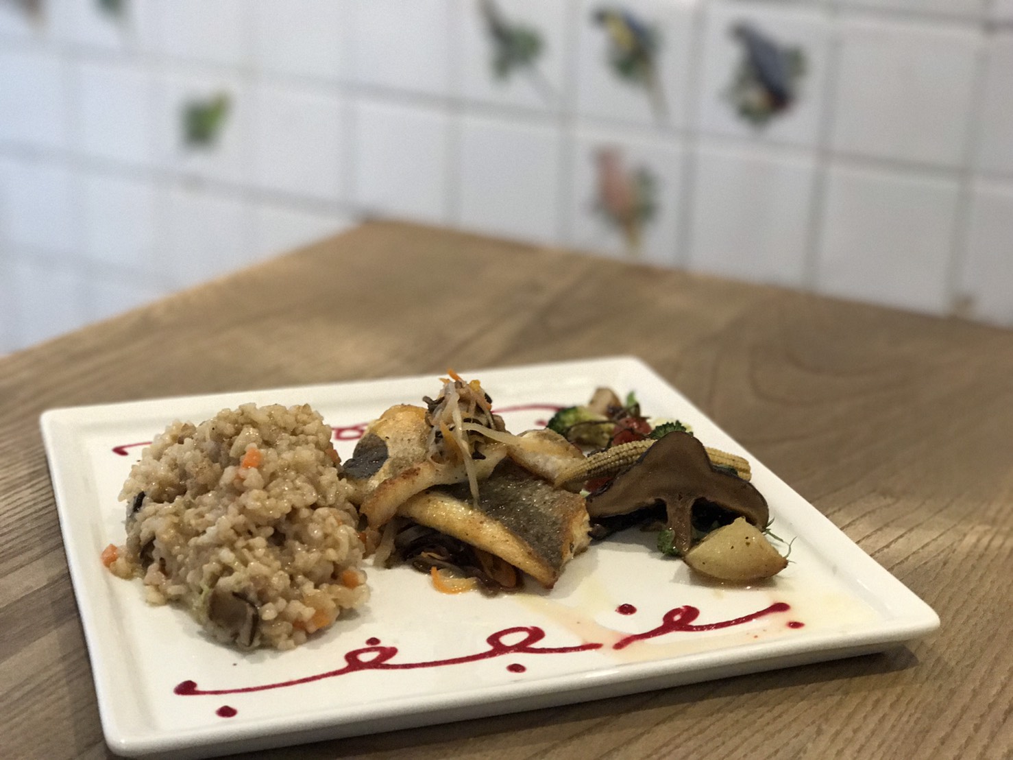 搭配香菇野菜燉飯的「五柳枝風味海鱸魚」,魚皮酥香、魚肉細嫰,另附上肥厚的烤香菇,有吃烤肉的滿足感.